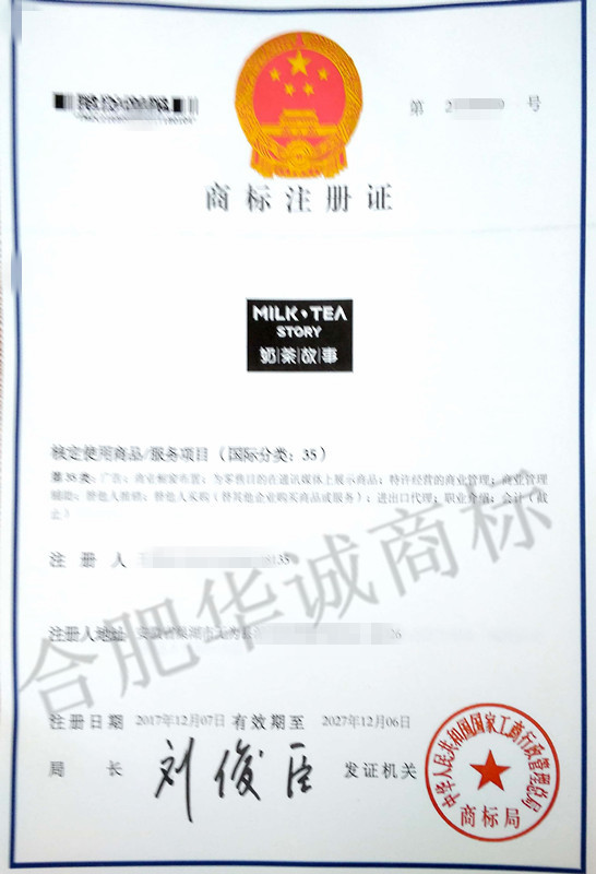 您委托我所代理商标注册申请,名称为“奶茶故事” 35类商标注册证已下达。