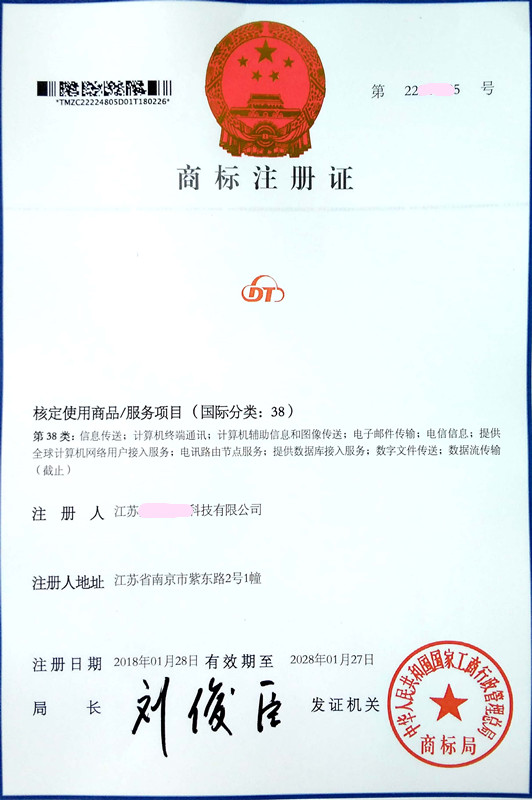 您委托我所代理商标注册申请,名称为“DT” 38类商标注册证已下达。
