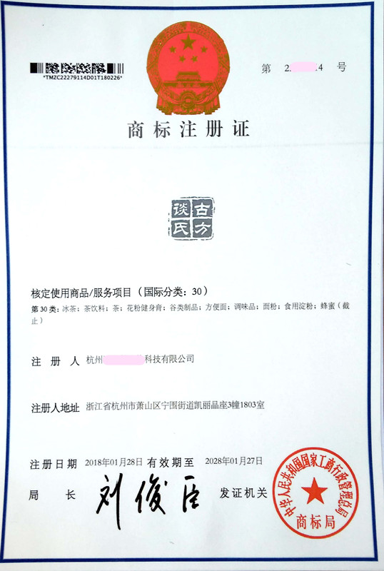 您委托我所代理商标注册申请,名称为“谈氏古方” 30类商标注册证已下达。