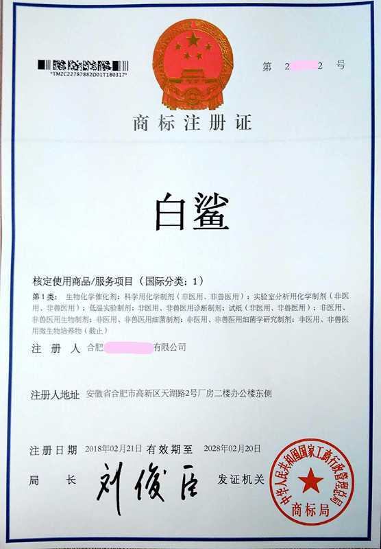 您委托我所代理商标注册申请,名称为“白鲨”1类商标注册证已下达。