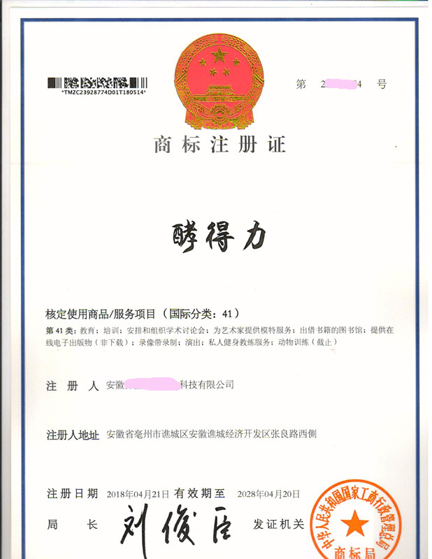 您委托我所代理商标注册申请,名称为“酵得力”41类商标注册证已下达。