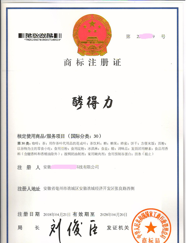 您委托我所代理商标注册申请,名称为“酵得力”30类商标注册证已下达。