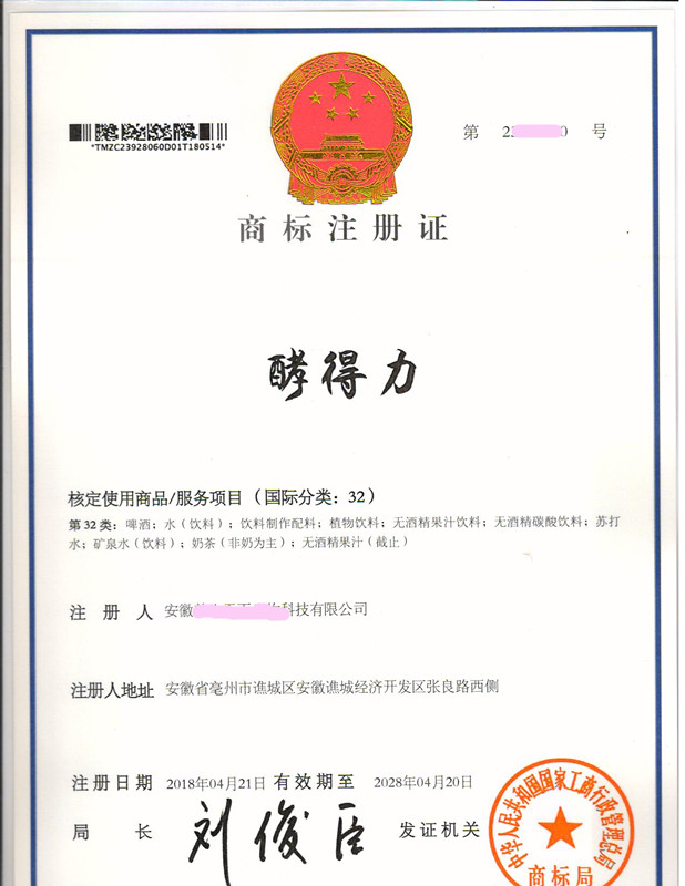 您委托我所代理商标注册申请,名称为“酵得力”32类商标注册证已下达。