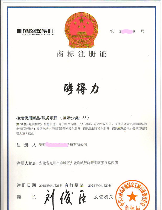 您委托我所代理商标注册申请,名称为“酵得力”38类商标注册证已下达。