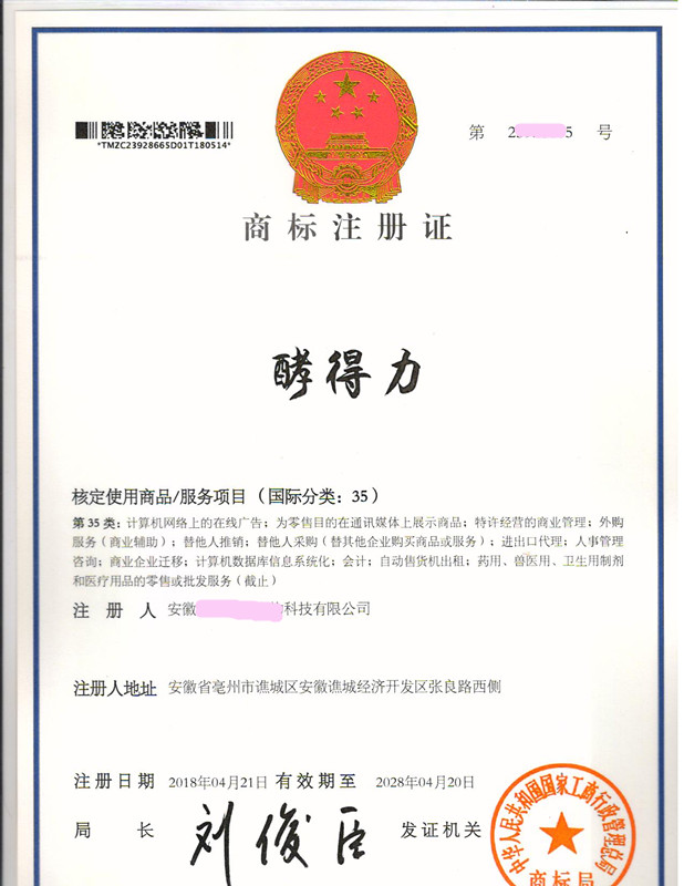 您委托我所代理商标注册申请,名称为“酵得力”35类商标注册证已下达。