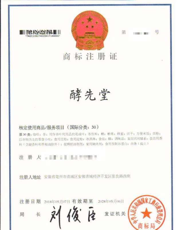 您委托我所代理商标注册申请,名称为“酵先堂”30类商标注册证已下达。
