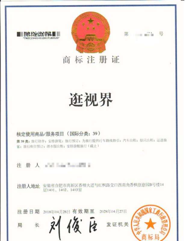 您委托我所代理商标注册申请,名称为“逛世界”39类商标注册证已下达。